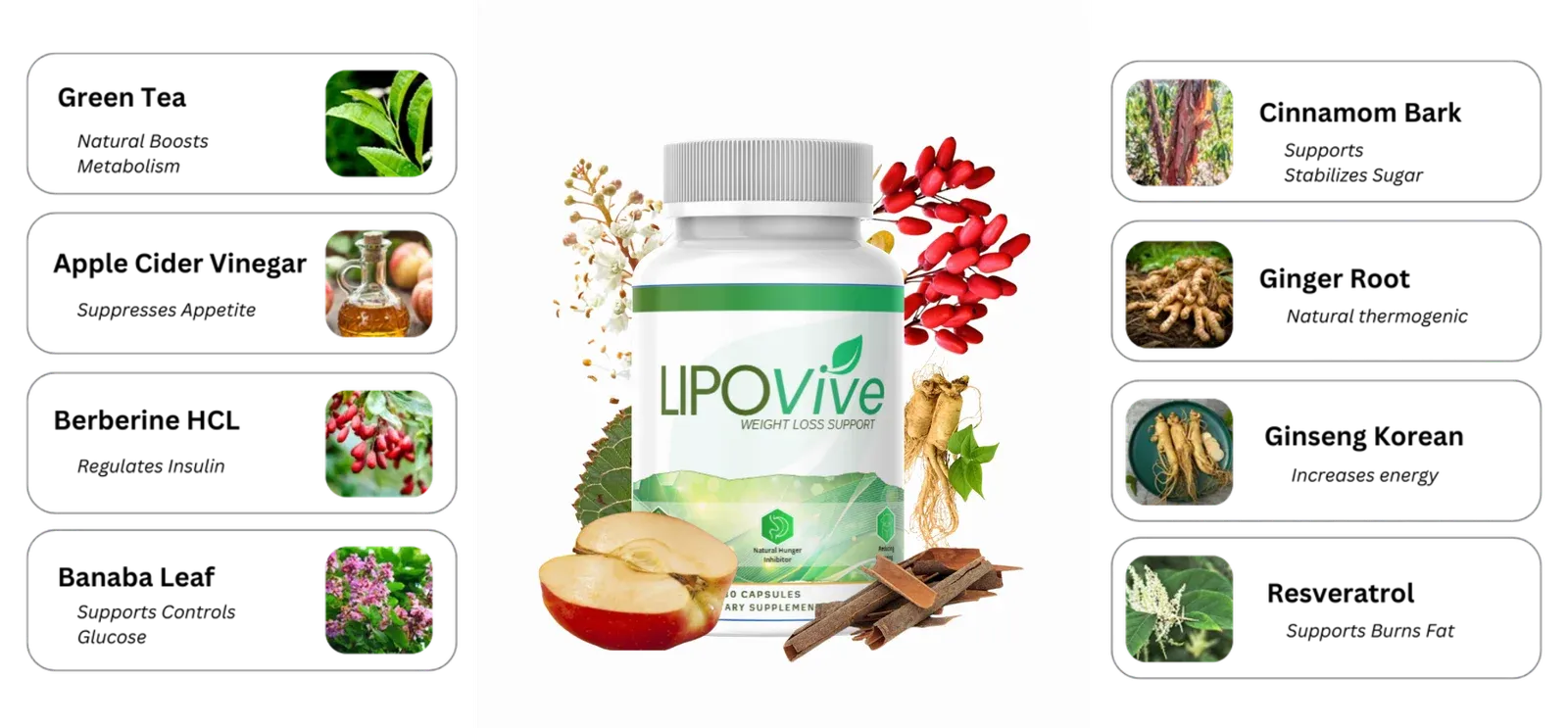 Lipovive features several active ingredients, including herbal extracts known for their weight loss properties, along with essential vitamins and minerals that help optimize overall health.